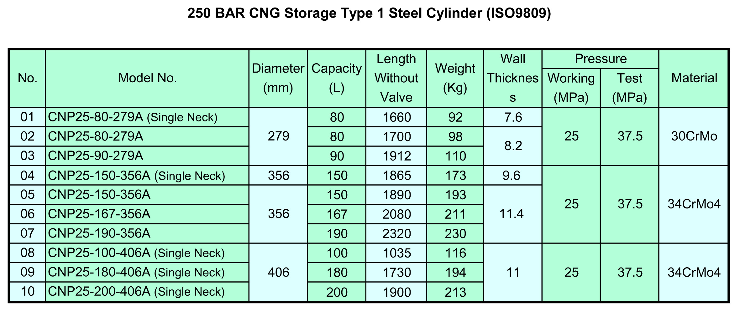 ISO9809 standard CNG steel cylinder is produced from seamless steel pipe, and is designed with high working pressure up to 250bar, so it can be assembled into cascade, used for CNG storage in CNG filling stations, and mobile gas supply module for factories and other places that need natural gas but without underground gas supply. Its low cost makes it the most perfect idea for CNG ground storage applications.